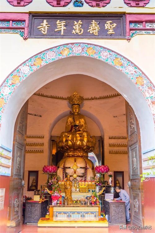 万年寺为峨眉山八大寺庙之一,该寺始建于东晋元熙二年(公元420年),相传为汉代采药老人蒲公礼佛处。整座寺院坐西朝东,依次为山门、弥勒殿、砖殿、巍峨宝殿、大雄宝殿。全寺除砖殿为砖石穹隆顶外,其余均为木结构。明代起建无梁砖殿,全以砖块砌就,无一木一柱一瓦,雄伟壮观,颇具古印度建筑风格,其设计思想源于古人天圆地方的宇宙观。该建筑400年来经历了18次地震却依旧安然无恙,被称为是中国古代建筑的一大奇观。
