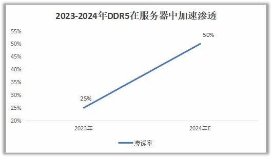 2023年,随着高性能服务器及AI等前沿需求的激增,DDR5在服务器领域的渗透率显著攀升至25%。2024年预计将达到50%,并预示着未来将持续保持增长态势。