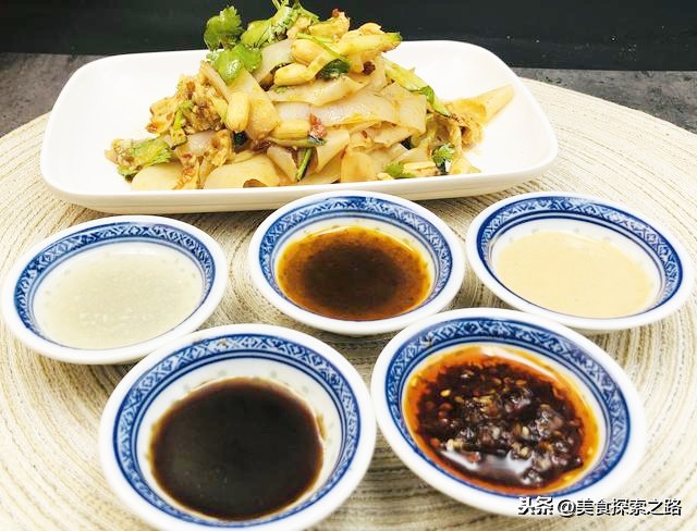 8、准备一个小碗,放入芝麻油,花椒油,醋,生抽,少许盐,鸡精,一起调匀 淋上即可开吃