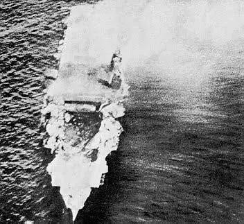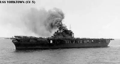13时00分,日军I-168号潜艇发现了约克城号,随即发射4条鱼雷,2条命中约克城号,1条命中护航的哈曼号(DD-142 USS Hammann)驱逐舰,两舰相继沉没。