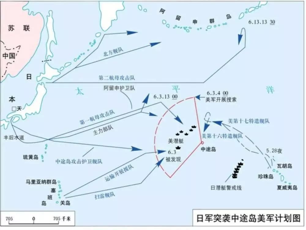 中途岛6月4日凌晨,日本第一攻击波机群36架俯冲轰炸机、36架水平轰炸机和36架零式战斗机开始从4艘航空母舰上同时起飞,108架舰载机在永友文市海军大尉的率领下出发攻击中途岛。南云中将命令侦察机搜索东、南方向海域,第二攻击波飞机提到飞行甲板上,准备迎击美国舰队。但是重巡洋舰利根号的2架侦察机因为弹射器故障,起飞时间耽误了半个小时,筑摩号的1架侦察机引擎又发生故障中途返航(这架飞机本应该正好搜索美国特混舰队上空),给日本舰队埋下祸根。