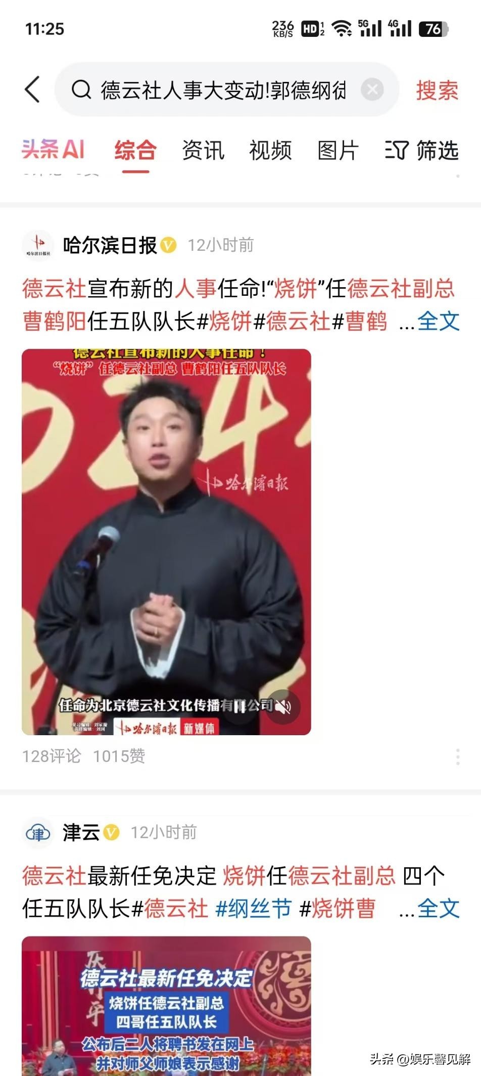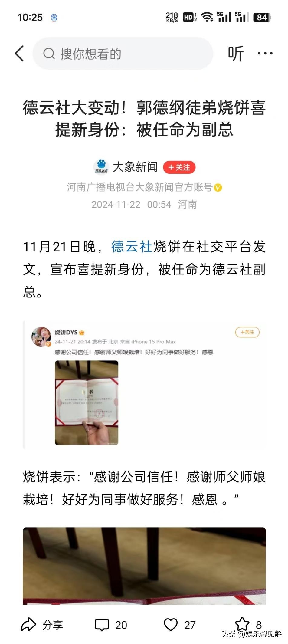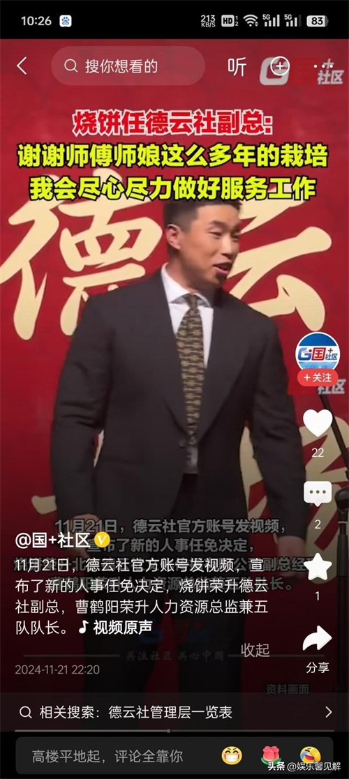 信息源:大象新闻发布的“德云社大变动!郭德纲徒弟烧饼喜提新身份:被任命为副总”的报道。