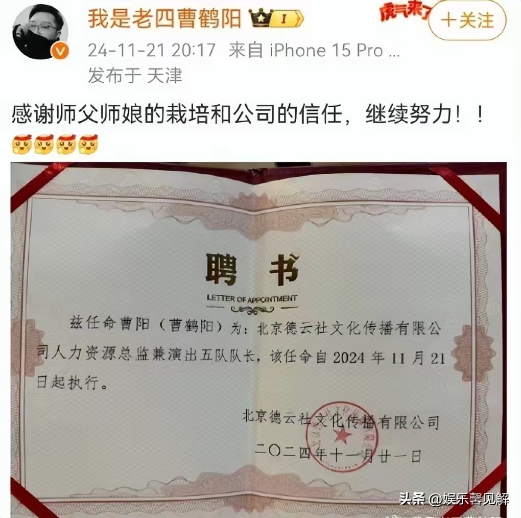 德云社人事大变动!郭德纲徒弟烧饼担任副总,曹鹤阳获颁两重身份