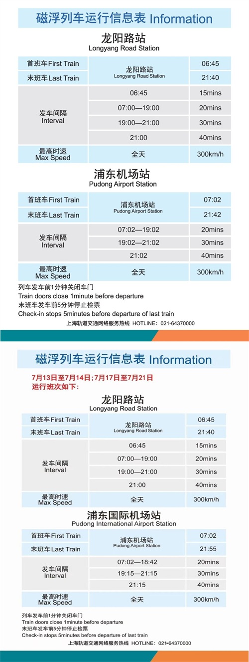 购买单程票的乘客可由磁悬浮龙阳路站或浦东机场站上车,运行至磁悬浮浦东机场或龙阳路站下车。
