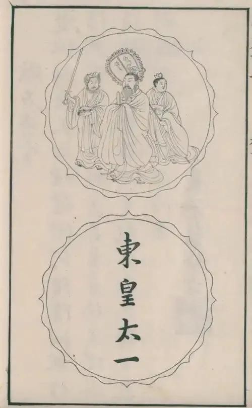 东皇太一的形象在不同时代和文献中有所差异。《楚辞·九歌·东皇太一》中记载,他是一位尊贵的天神,因祭祀太一在东方,故称“东皇太一”。而在一些古代绘画中,如张渥所绘的《临李公麟九歌图》和萧云从所绘的《刻画雅辑 离骚全图 上》,东皇太一被描绘为峨冠博带、踏云而来的仙人或呈帝王像的尊贵形象。