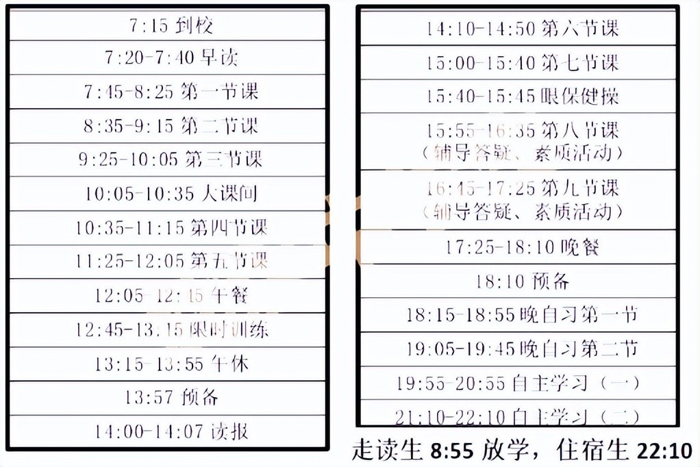 早上7:20早自习,上午12点放学。一堂课40分钟。中午12:50进班午休,14:00开始下午课程、17:10下午课程结束。18:00晚自习,20:00晚自习结束。20:10—21:20有家长值守的晚晚自习。
