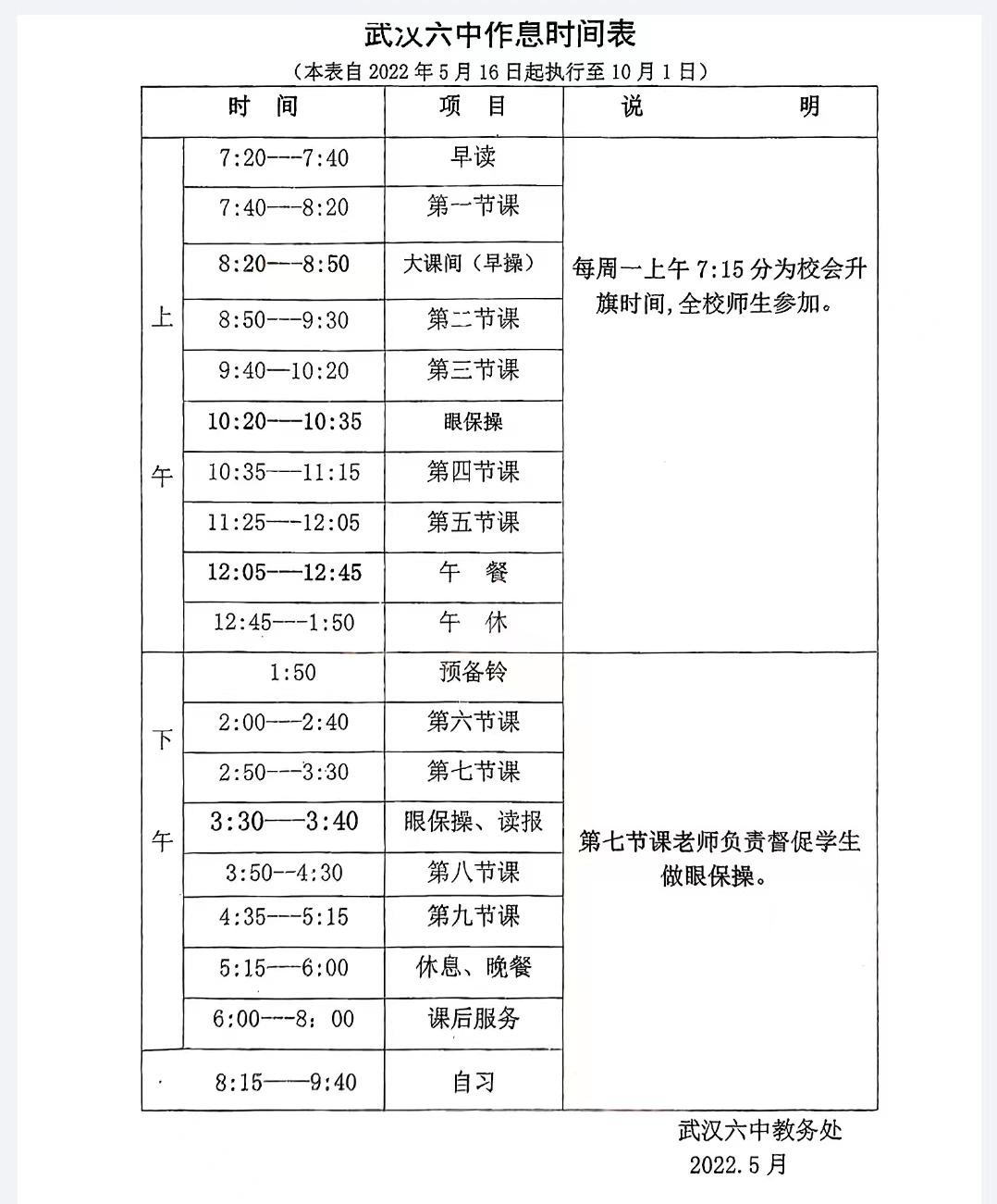 作息时间:早上7:30上课,晚上7:50下晚自习,全天封闭式管理,学校食堂由武汉大学后勤集团饮食服务中心承办,食品安全有保障。