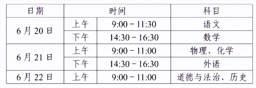 文化课考试时间为6月20-22日,科目为语文,数学,外语(含听力测试),物理、化学(合卷),道德与法治、历史(合卷)。
