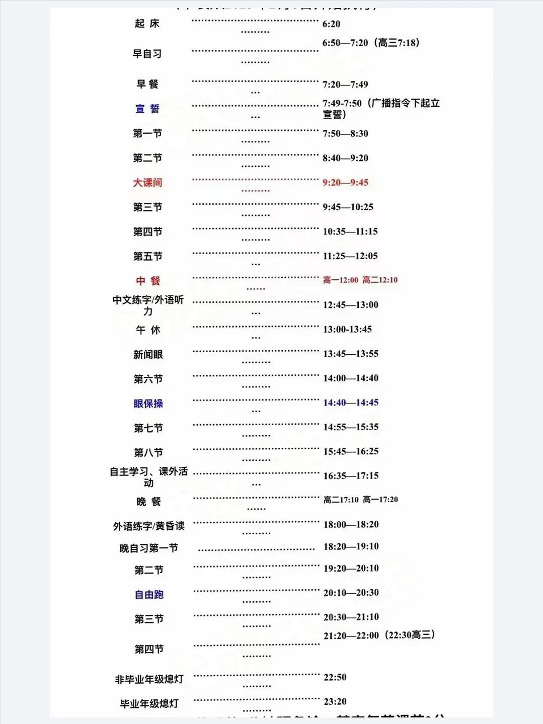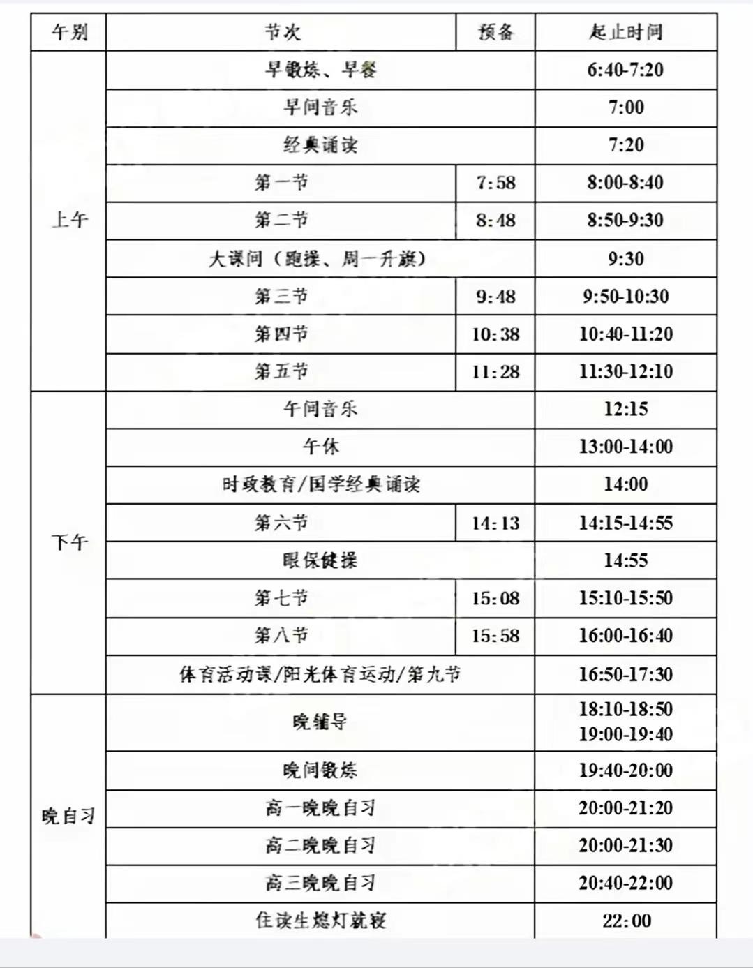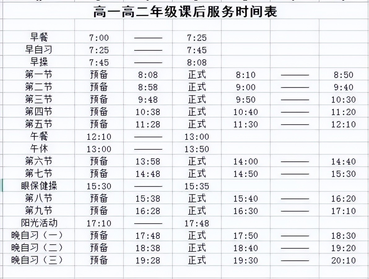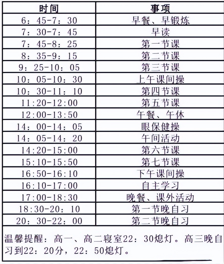 学生早上7:20前到班,中午12:00-13:00为学生午餐时间,13:00前到班,13:00-14:00为学生训练英语听力和午休时间,下午17:10-17:50为学生晚餐时间,17:50之前到班,高一高二20:50放学,高三21:00放学。周六正常上课,17:10放学。