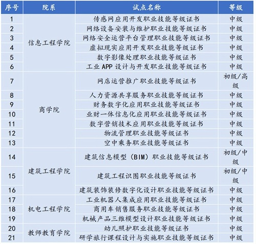 同时,该校积极参与实施 1+X 证书制度试点,将职业技能等级标准有关内容及要求有机融入专业课程教学,优化专业人才培养方案。2024年,应该申报成功 21 个 1+X 证书制度试点。驻马店职业技术学院 2024 年职业等级证书一览表如下: