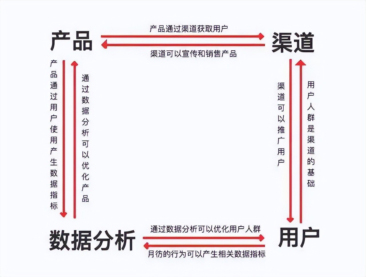 做好运营关系到产品、渠道、用户、数据分析四个方面,可以通过下图看到这四者的关系。