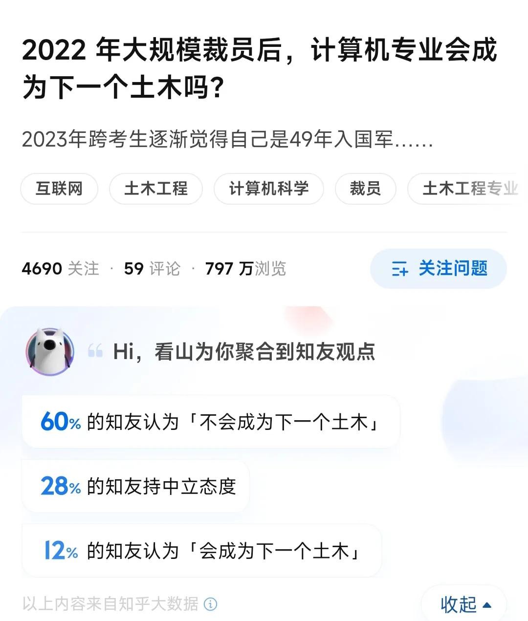 在知乎上,有60%的网友认为计算机专业不会成为下一个土木,28%的人保持中立,12%认为会土木化,如果单纯从就业上来说,计算机和土木目前的就业都不太好,主要是目前经济下行导致的就业率下降,当第一季度的失业率达到18%,第二季度的青年人失业率达到23%,后来统计局已经不提失业率了,因为数据确实不好看,放到以前这就是经济大萧条,所以现在很多青年人不好找工作,主要是全球背景下经济不景气造成的。