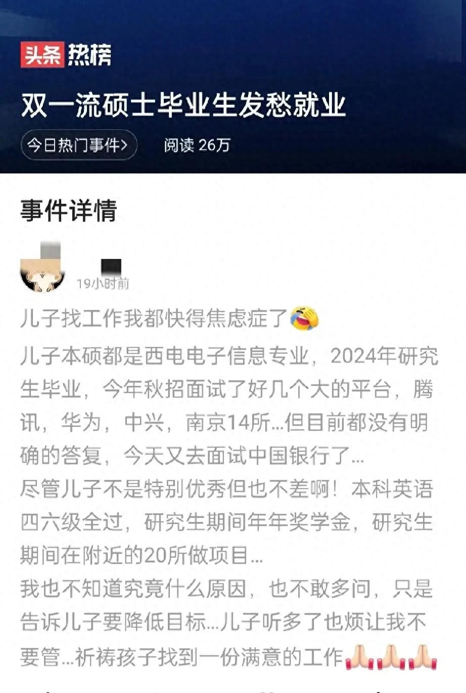 我查了下,西电的顶尖专业里面就有电子信息工程,在中国电子信息领域,西电享有较高的声誉和地位。所以本硕都是西电的,还是最强专业毕业,找工作都遇到了前所未有的困难,你应该可以想象其他毕业生所面临的就业环境。