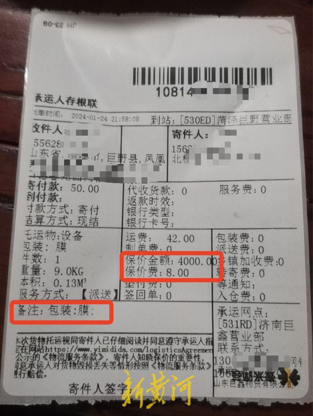 根据纪女士提供的仪器图片显示,仪器侧边开裂,电子屏下方的支柱弯曲。此外,快递面单上备注了“包装:膜”,“保价金额为4000元,保价费为8元”。纪女士表示,“在发货前,我和济南巨鑫营业部沟通过,要求对器材进行包装,并且还购买了4000元的保价,事发后对方过了一个月才联系我,说根据相关规定赔付410元,但又拿不出具体依据。”