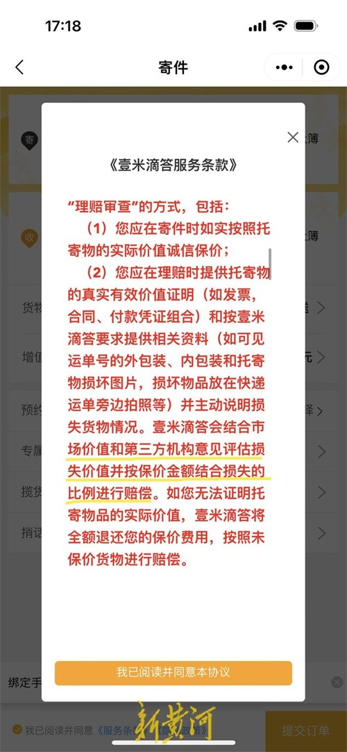 记者在壹米滴答小程序的服务条款中找到了相关保价与赔偿条例:壹米滴答为您的托寄货物提供保价服务,应根据托寄货物的实际价值进行足额投保(即保价金额等同于货物实际价值)。纪女士表示,“我当时是线下办理的托寄货物,工作人员只是询问我想要保价多少钱,并未告知相关条例。”