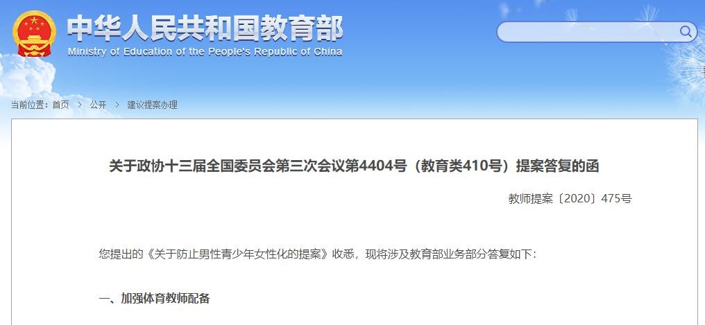 日前,教育部官网发布了对全国政协委员斯泽夫提出的《关于防止男性青少年女性化的提案》的答复函,表示将从加强体育教师配备、加强学校体育制度顶层设计和深入开展健康教育等方面着力,更多注重学生“阳刚之气”的培养。答复中并没有特别提及 " 男 "" 女 " 之别,而是将 " 强健体魄 " 概念扩展至所有学生。