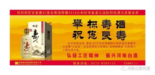 11月28日,不少豫酒业内人士发现,当日的河南日报一版报眼位置,出现一个新面孔——百泉春,醒目的“举杯寿酒,祝您长寿”广告语上方,是一行“热烈祝贺百泉春52度长寿酒荣获2016比利时布鲁塞尔国际烈性酒大奖赛金奖”的小字!画面简单大方,而又不失霸气。