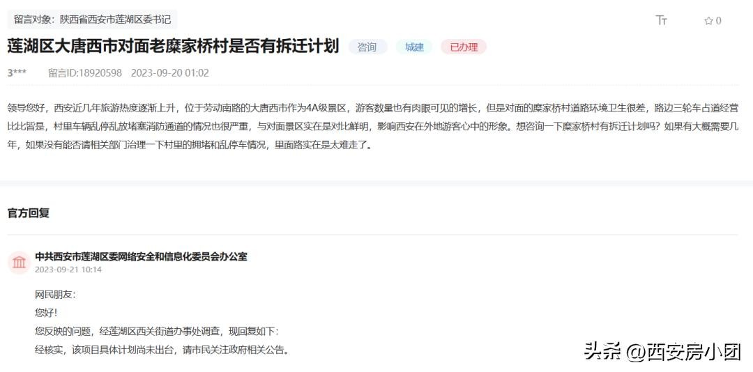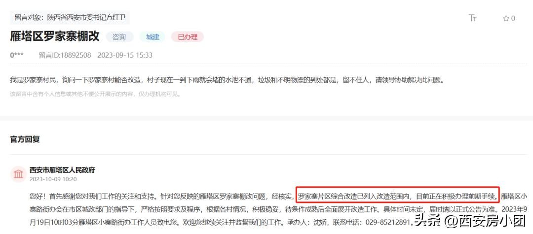 位于雁塔区的罗家寨村,近期有村民在领导留言板上提问,罗家寨村能否改造。10月9日官方回复罗家寨片区综合改造已列入改造范围内,目前正在积极办理前期手续。