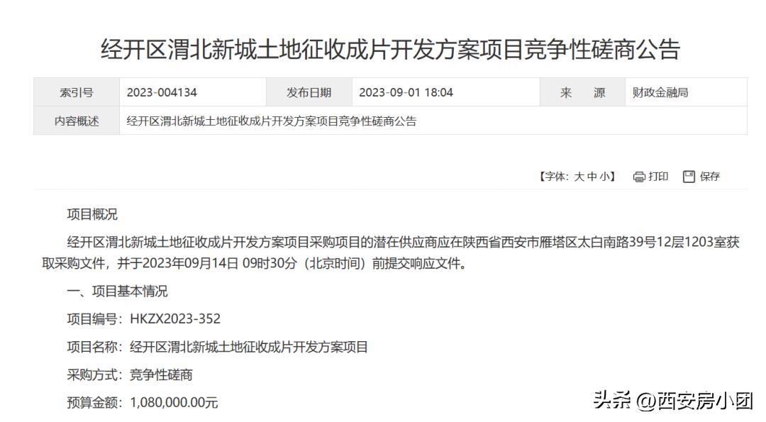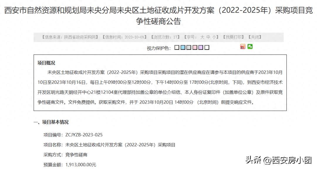 10月9日,西安市自然资源和规划局公布了一份采购公告,是关于未央区土地征收成片开发方案(2022-2025年)。