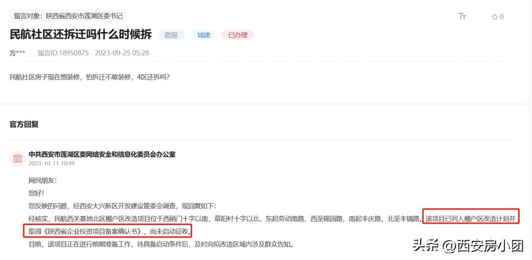 10月11日官方回复,该项目已列入棚户区改造计划并取得《陕西省企业投资项目备案确认书》,尚未启动征收。