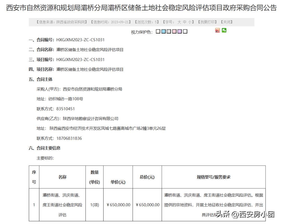 9月底,西安市自然资源和规划局发布一份采购招标公告,是对灞桥、洪庆、席王三个街道进行开展土地征收社会稳定风险评估。