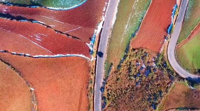 每到秋冬时节,一部红土地翻根待种,另一部分红土地已经种上绿绿的青稞或小麦或其它农作物了,远远看去,就像调色板,色彩斑斓明晰。天然的红土和耕作在上的庄稼,织成一幅幅色彩浓烈的画卷。
