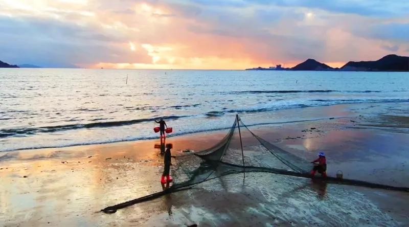 红霞满天,金沙遍地;连绵的渔排或曲或折,迤逦而去,与沙滩碧水融成一体;又有远帆近舟点缀其中,似在潮起潮落中低吟浅唱。
