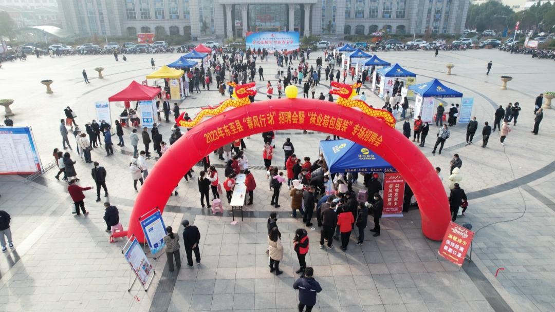 1月11日上午,东至县人社局在尧渡镇市民文化广场举办2023年东至县“春风行动”招聘会暨“袜业箱包服饰”专场招聘会。