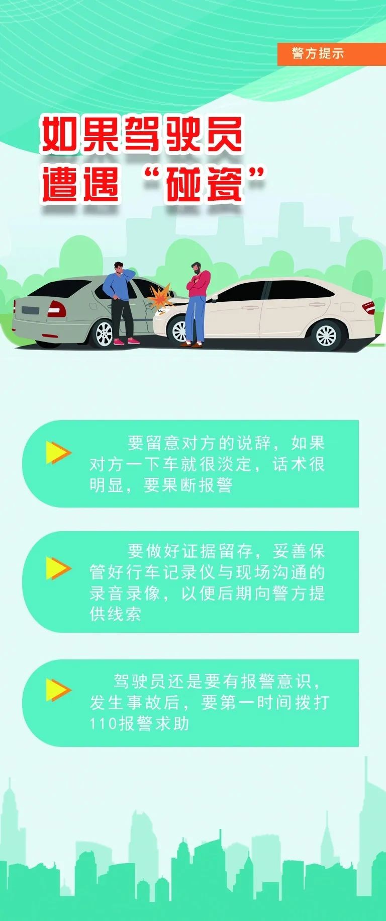 如果遭遇“碰瓷”该如何面对?李京给广大驾驶员提出建议,首先,要留意对方的说辞,如果对方一下车就很淡定,话术很明显,要果断报警;其次,要做好证据留存,妥善保管好行车记录仪与现场沟通的录音录像,以便后期向警方提供线索;最后,驾驶员还是要有报警意识,发生事故后,要第一时间拨打110报警求助。