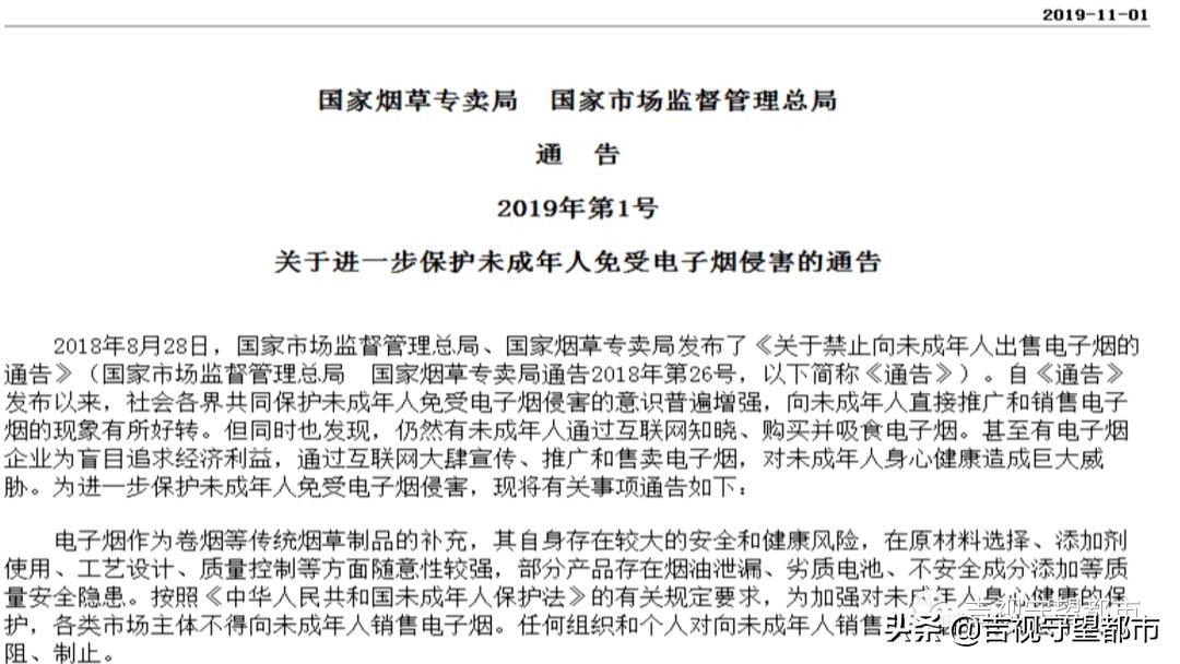 在去年8月发布的《关于禁止向未成年人出售电子烟的通告》基础上,国家烟草专卖局和国家市场监督管理总局决定,再次联合发布通告:不得通过互联网发布电子烟广告,并敦促电商平台下架电子烟产品。