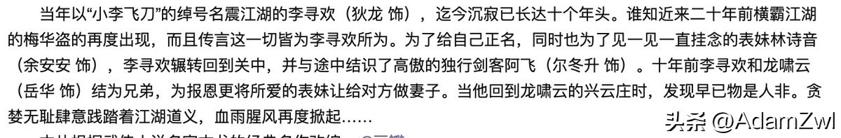 ‘小李飞刀’李寻欢,又是一位耳熟能详的名字,为了报恩,居然把自己心爱的表妹让给对方做妻子,舍弃家产浪迹天涯,我完全不认同他的价值观,《小李飞刀》更像部爱情悲剧小说。这部电影最大亮点是尔冬升饰演的阿飞,所有男女主角都处于颜值巅峰,为大家贡献这部经典电影,改编过多个版本的影视剧,值得一看的是焦恩俊《飞刀问情》。