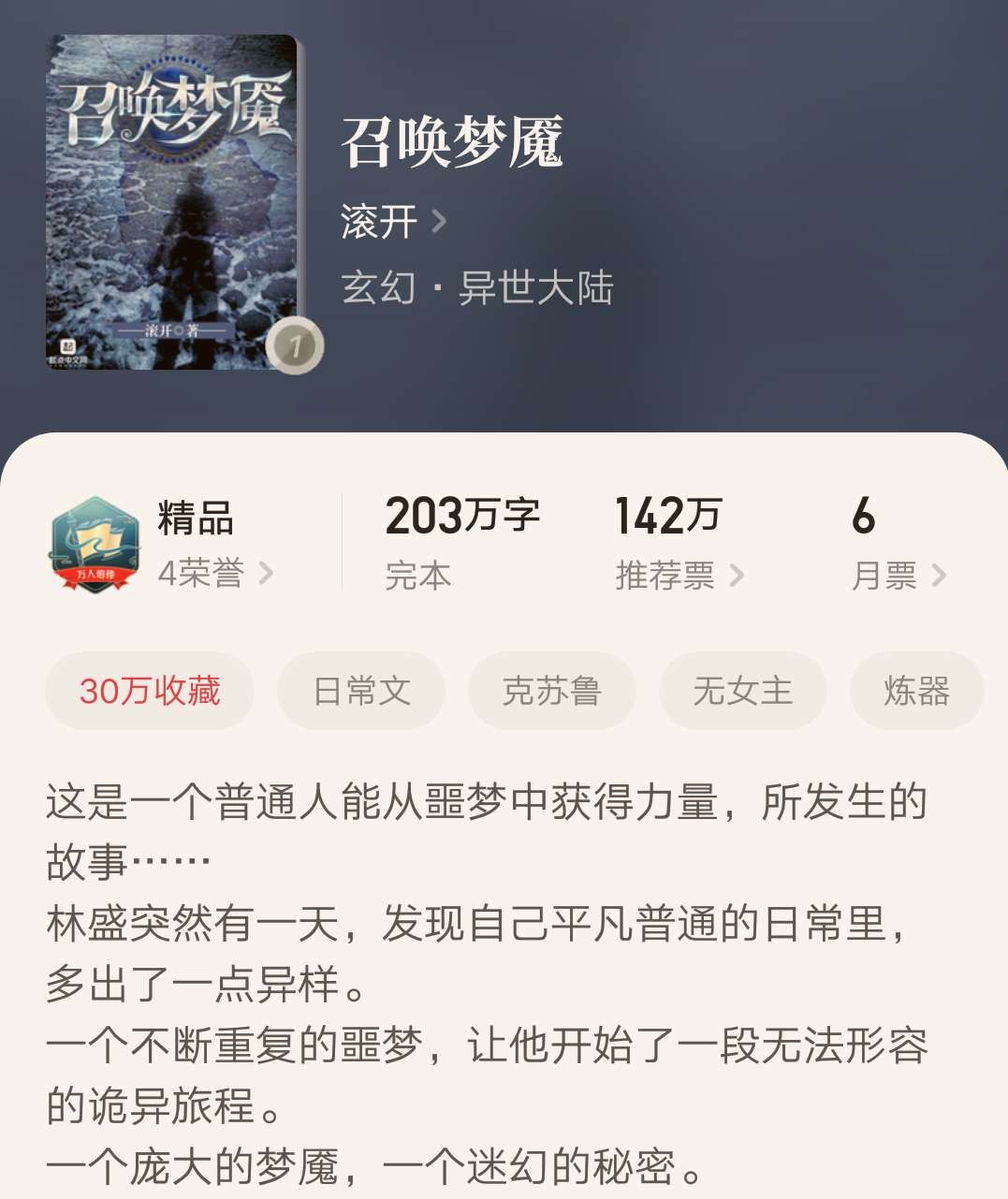 黑暗灵异,智商在线,升级逻辑合理,悬念丛生。这是一个普通人从噩梦中获得力量的故事。主角通过控制梦中活动,探索这个特殊的梦中世界,然后在梦中获得力量升级打怪。梦中的世界就是一个游戏场,让小说也带着一股游戏味。滚开的书如他的笔名一样让人印象深刻,难以忘怀。小说虽然风格偏暗黑,但是角色智商在线。