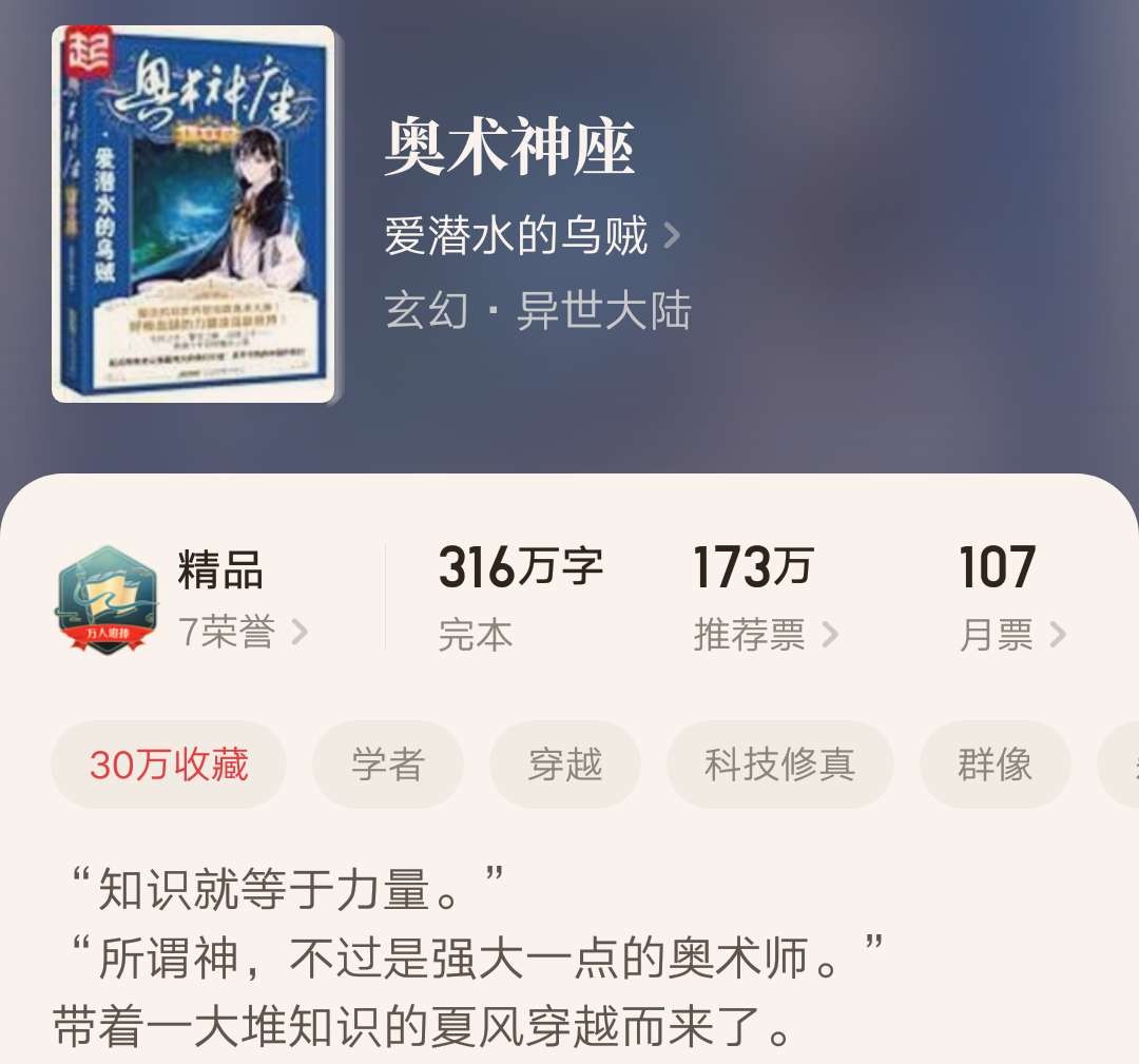 当科学遇上魔法,当奥术师不再通过咒语而是真理来探寻力量的源泉,那么这一定是个美妙的世界。这本小说很是符合乌贼的气质,是一本另辟蹊径的奇幻神作,也是网文界科学魔法战胜古老魔法的经典代表作。
