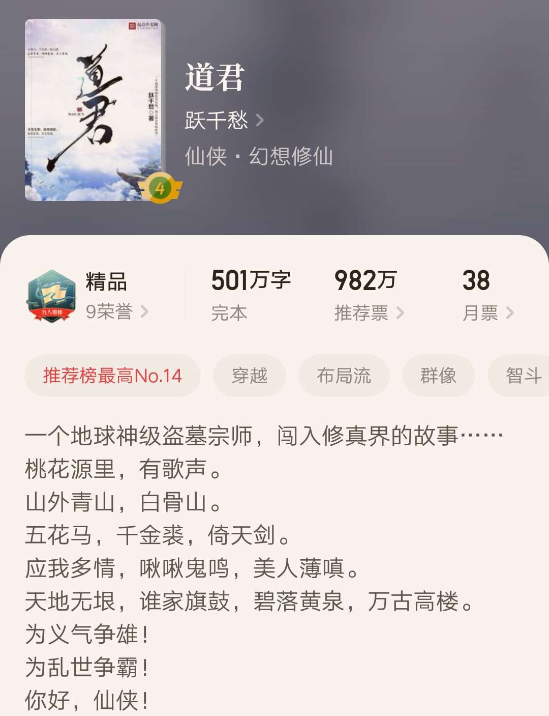 小说讲述了盗墓宗师闯入修真世界的故事,而这位盗墓宗师便是穿越而来的主角了。这部作品是跃千愁笔下的精品,他将仙侠里的妙趣仙境和人物之间的错综复杂演绎地深入人心,文笔突出,谋略设定让人拍案叫绝,这就是老牌作者的功底!