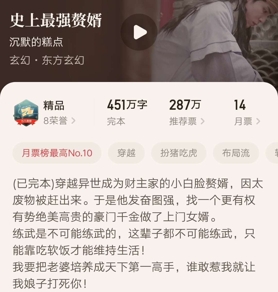 小说讲述了一个上门做女婿的小白脸,不打怪升级练神功,生活美滋滋的故事。废柴崛起不是唯一看点,各路特色人物因利益牵动引发的各种剧情反转和打脸更是让人欲罢不能。虽然小说满满的都是套路,但是作者在剧情的把控上,对细节的处理上,都非常的娴熟老道,让故事一路爽到的巅峰。最可贵的是,爽文却不白,小说在作者笔下还有着独有的精神内核,书中各种人性之恶让人叹为观止。