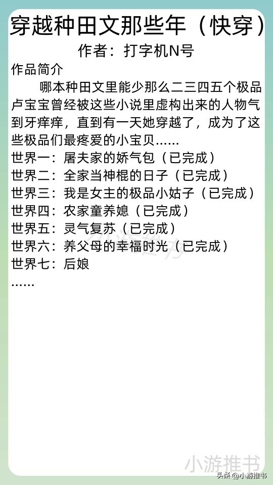 03.《穿越种田文那些年(快穿)》 作者:打字机N号 //字数:87w