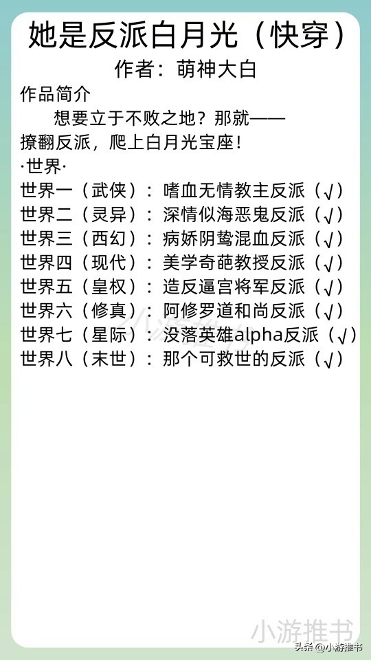 17.《她是反派白月光(快穿)》 作者:萌神大白 //字数:71w