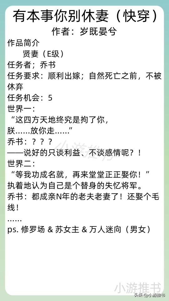 20.《有本事你别休妻(快穿)》 作者:岁既晏兮 //字数:20w