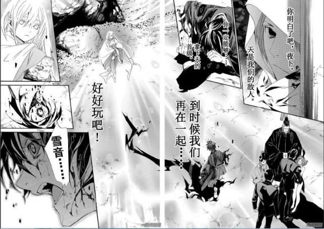 而夜斗对天的憎恨正是黄毛所想要的,他需要一把利器,去毁灭这片天。而在雪音看见毘沙门要斩杀术士时,想起了术士(夜斗的父亲黄毛)若是死去,夜斗也会消失,故指引夜斗砍向了毘沙门。而夜斗的反应,似乎正说明着黄毛幼时对他灌输的思想影响之大。