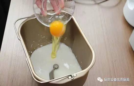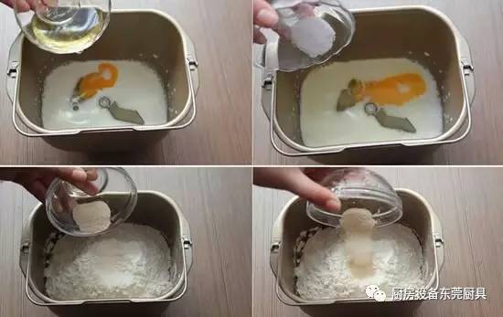 1、首先往面包桶里依次倒入牛奶、鸡蛋、植物油、盐、糖、高筋粉、即发酵母这些材料。