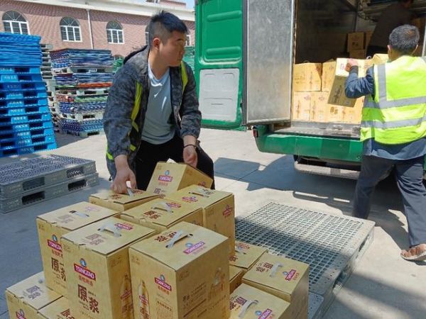 大院内,一台叉车正忙碌地将一箱箱包装完成的原浆啤酒从高处搬到地面上,每次可搬运五六十箱,地面上很快就摞成了一座小山。当运输车开过来时,叉车再将其搬到车厢后部,运输工人立即进行装车。