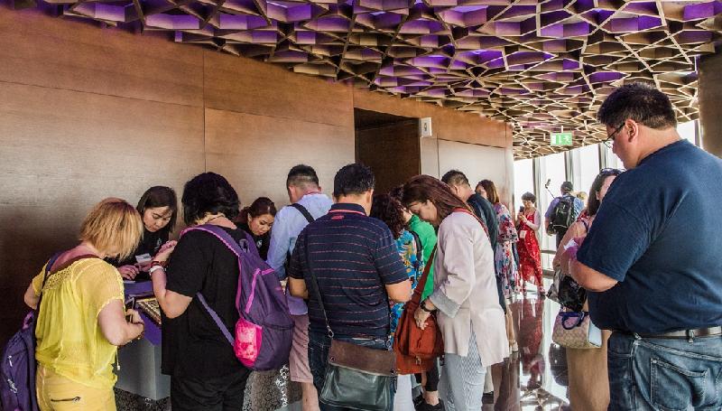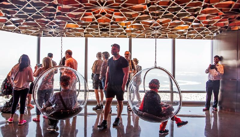 登上哈利法塔的148层可以获得一杯果汁,大厅里还有舒服的沙发可以休息。最热闹的是124层,大多数游客集结于此。这里有很舒服的坐椅和各种体验式消费项目,大厅的设计也颇有创意。