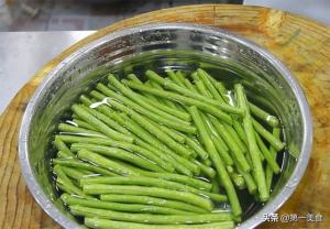 准备长豆角一把,清洗干净,切掉两头再切成长段,放入清水中,加入一勺食盐浸泡一下,用淡盐水浸泡豆角会更加青翠,有效去除农药残留。