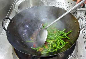 从锅边淋入一点料酒去腥,快速翻几下,加入适量的清水,倒入长豆角,再加入老抽3克提色,蚝油5克增鲜,生抽5克,食盐2克,鸡粉2克,十三香1克,把调料炒散炒化,盖上锅盖焖煮3分钟。