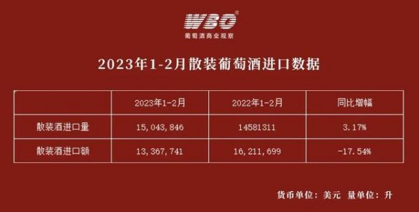 为何如此?葡萄酒进口商,厦门丰德酒业总经理武永磊分析道:去年11月,很多城市仍在封控之中,放开后,全国很多人感染,工作也出现了停滞。进口商在那段时间的订单延后,会反映在今年一二月的数据上,这是正常的。