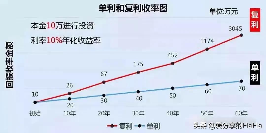 可以看到我们的本金都是10w,每年都是10%的收益恒定利率,在初始的1年内,单利和复利的收益差距并不是特别大。但是到20年后,你会发现,单利和复利的收益差距开始有了倍数级的差别,而到第60年的时候,单利的本利和是70w,复利的本利和居然达到了3045w,两者相差了40多倍![震惊]所以,同样都是3.5%的收益率,一个单利,另一个是复利,两者随着时间的推移,差距就会越来越大~