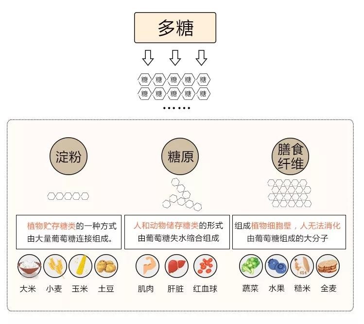 超过10个以上单糖结合的复杂糖类称为多糖;淀粉类食物、纤维素、糖原都属于多糖;