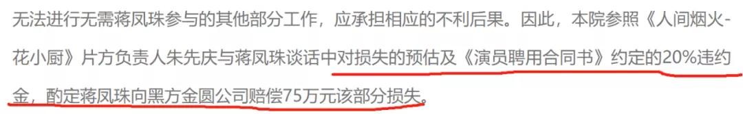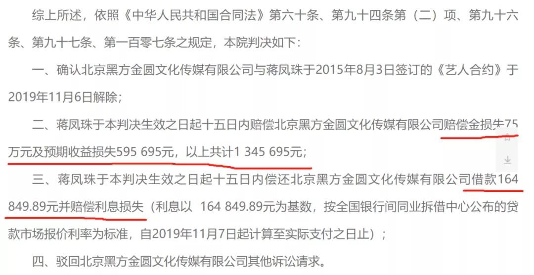 2、要蒋佳恩赔偿损失超过575万元(包括赔给新圣堂影业的约129万,黑方金圆自己给艺人出的培训费约37万、报销费约9万,以及损失的预期收益400万,即蒋佳恩如果后面正常拍戏产生的收益);