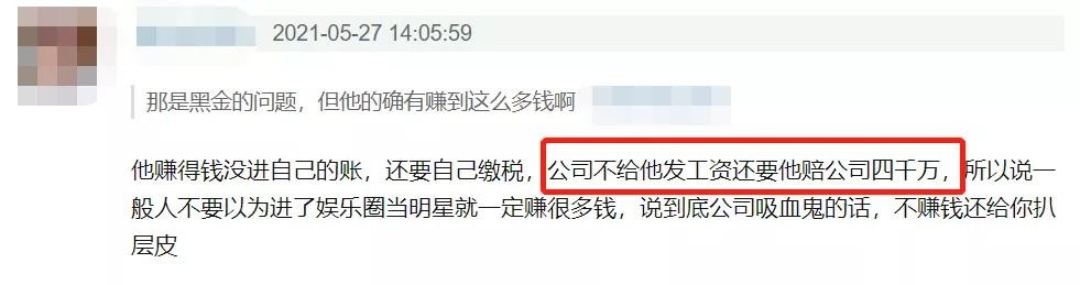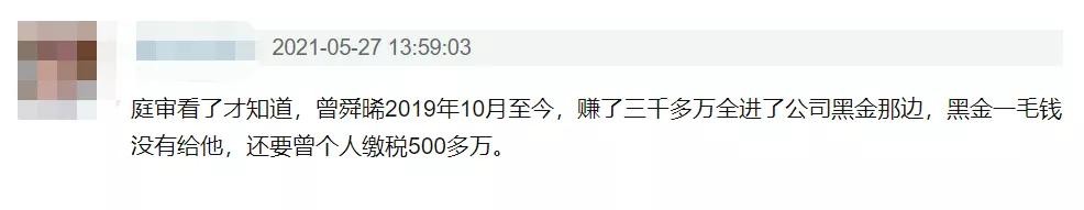 开庭就今年5月份的事儿,曾舜晞从2019年10月赚的三千多万,黑金一分都没给,还要他自己缴个税500多万。