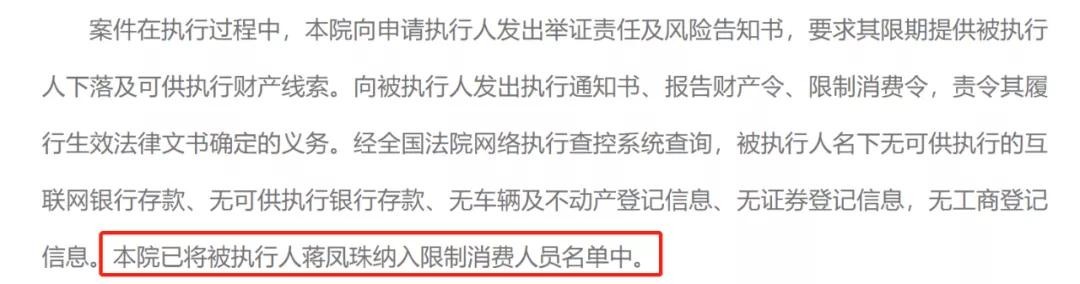 法院后续还出具了一份执行裁定书,说找不到蒋佳恩在哪儿,没钱可还,所以她也被纳入限制消费人员名单中。